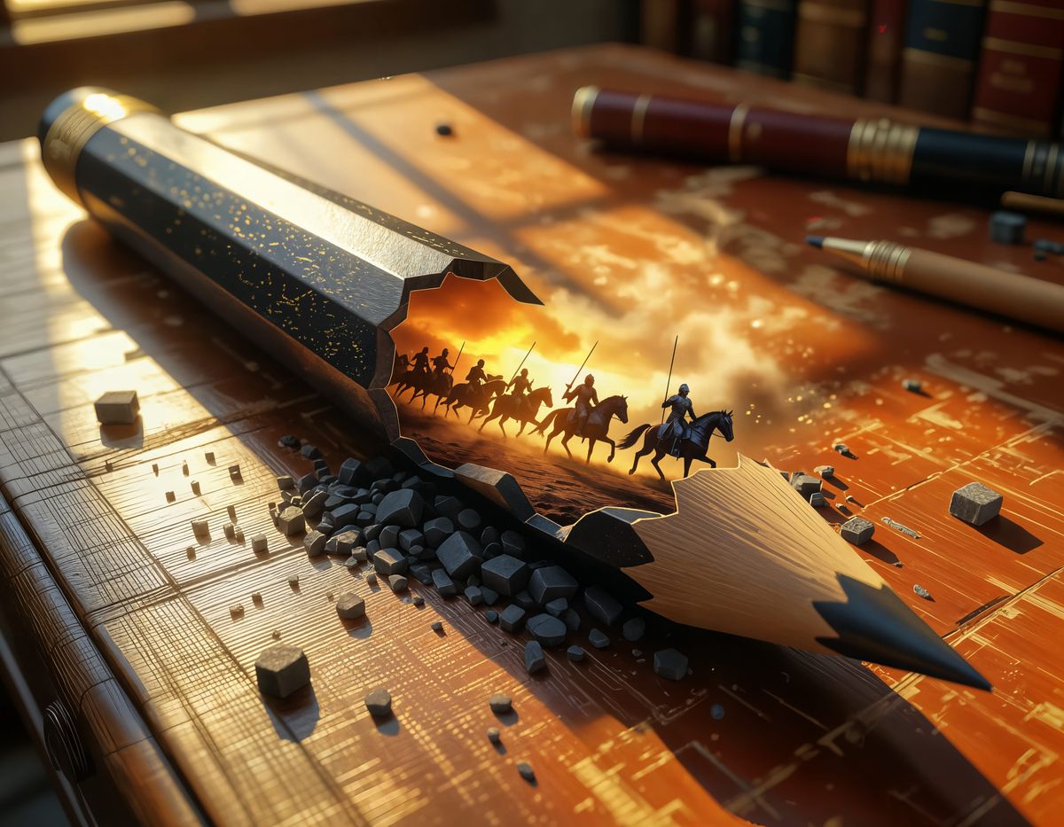 This image shows a hyperrealistic fantasy concept art scene of tiny knights battling inside a large broken pencil. Dramatic lighting creates an epic scale, rendered with vivid colors and strong contrasts.
