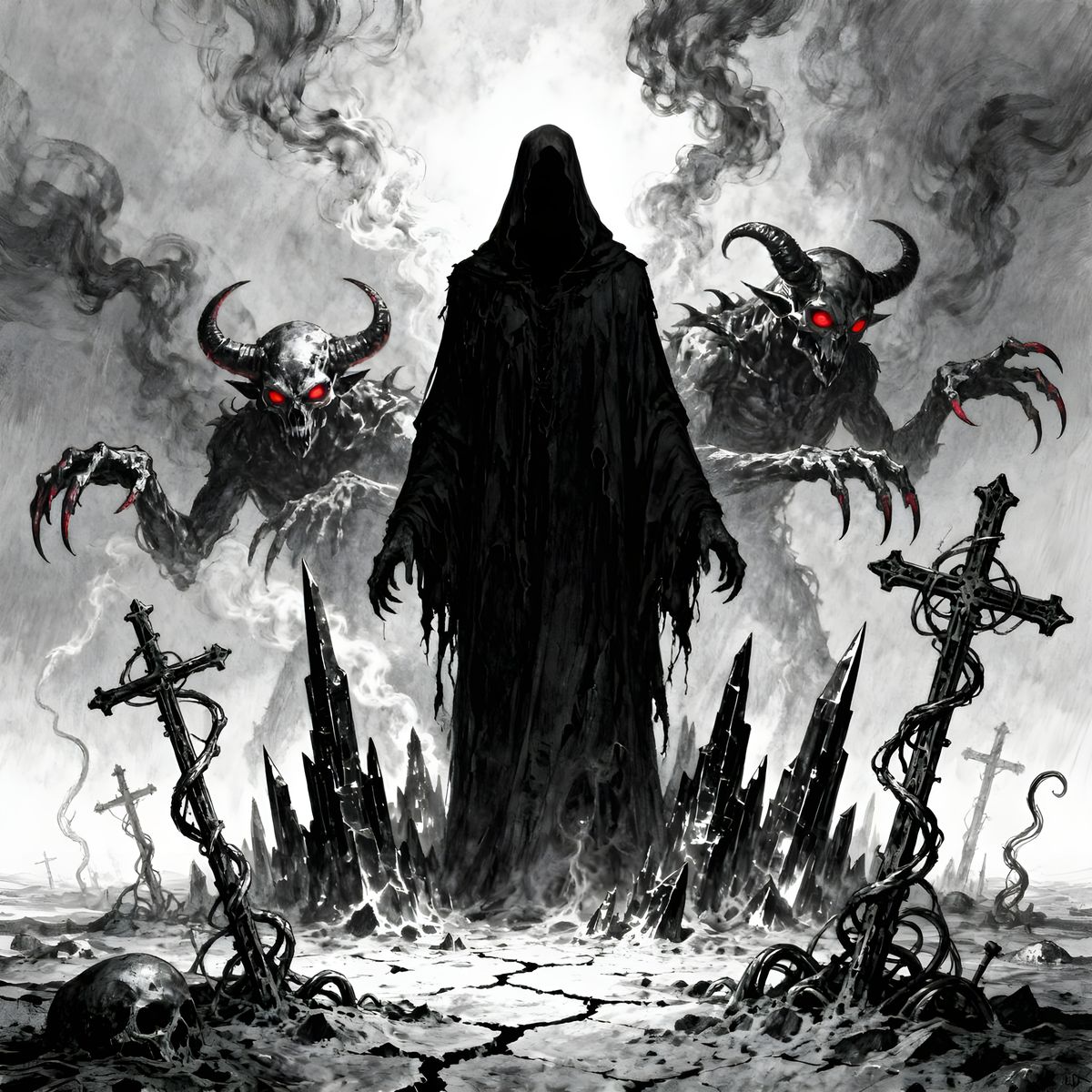 This image depicts a dark figure in a hellish landscape filled with demonic entities and twisted crosses, rendered in a bold, ominous style with stark black and white contrast.