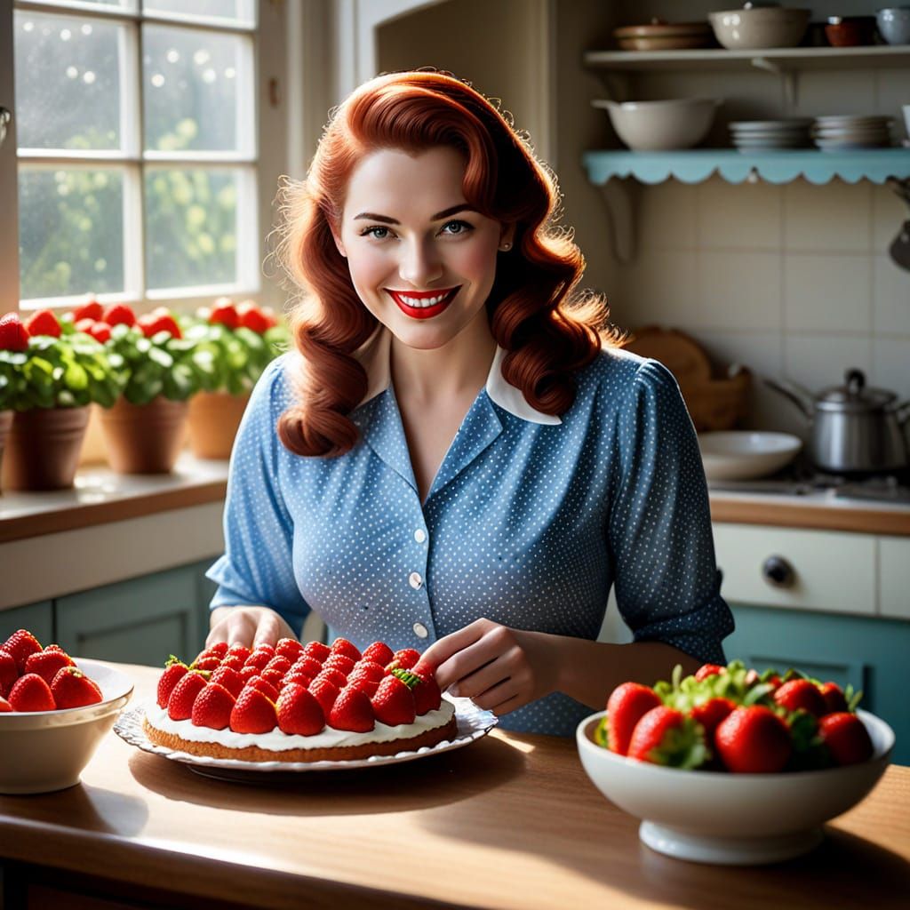 This image shows a beautiful young woman baking a strawberry cake in a 1950s kitchen. The early morning sun casts shadows around her in this vintage-style scene.