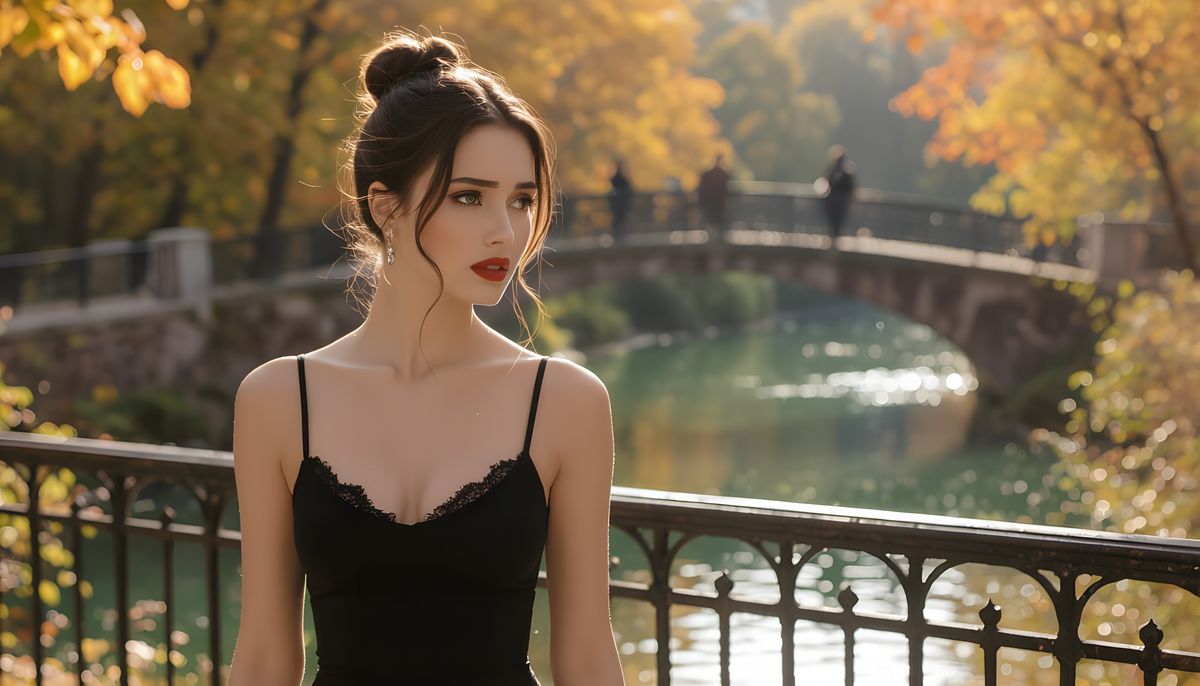 A sorrowful woman pauses on a bridge in an autumnal park. The scene evokes the styles of impressionist painters through its use of light, color, and high-resolution detail.