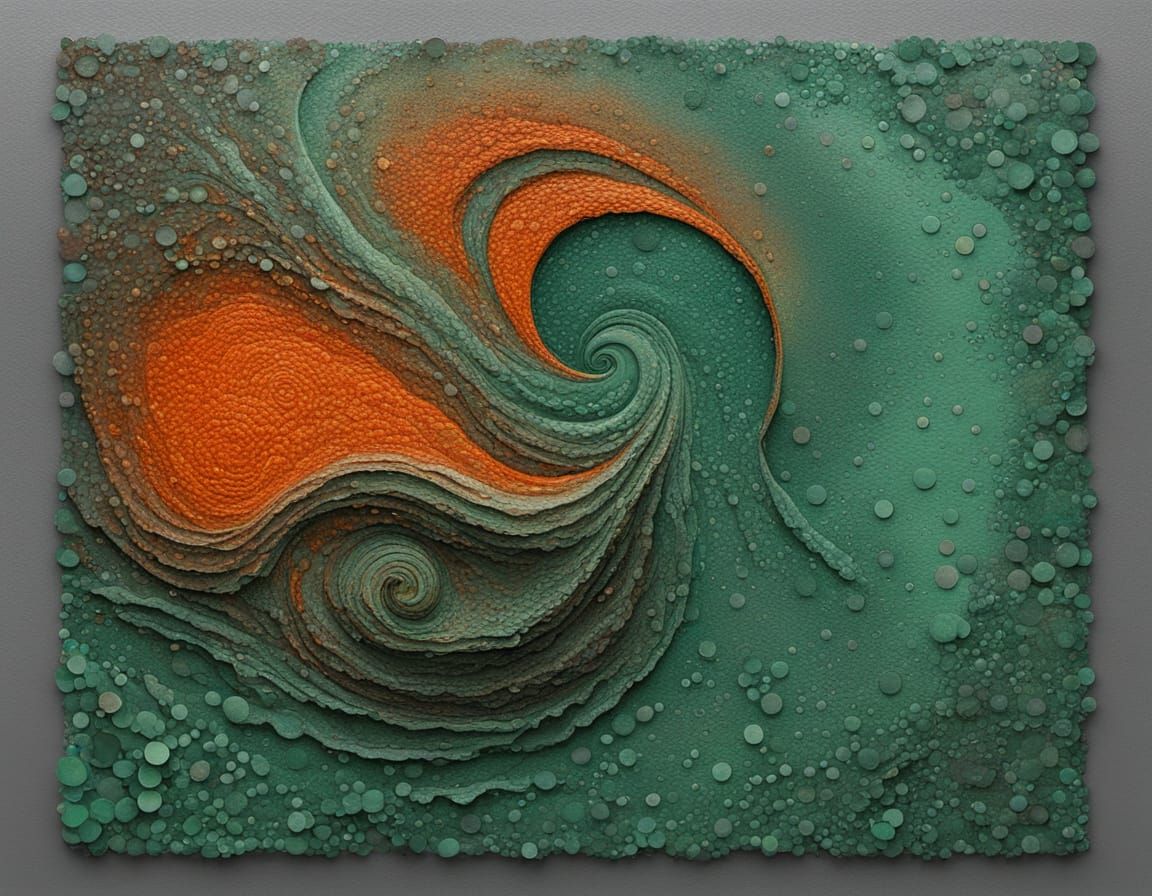 This abstract surrealism painting features a blend of green, burnt orange, and buttermilk hues. Created with kinetic pointillism techniques for a unique visual effect.