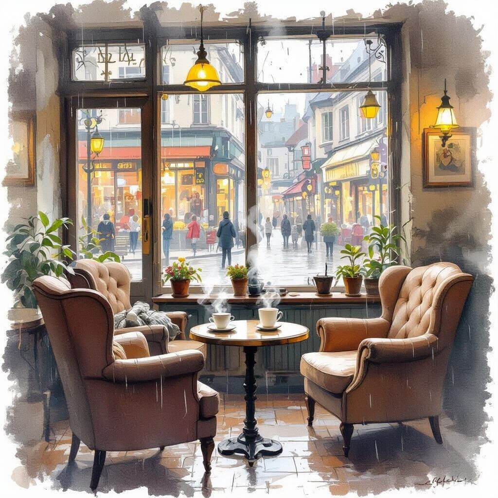 A serene image of a coffee shop bathed in warm light, with steaming cups and inviting armchairs. The scene evokes the charm of impressionism.