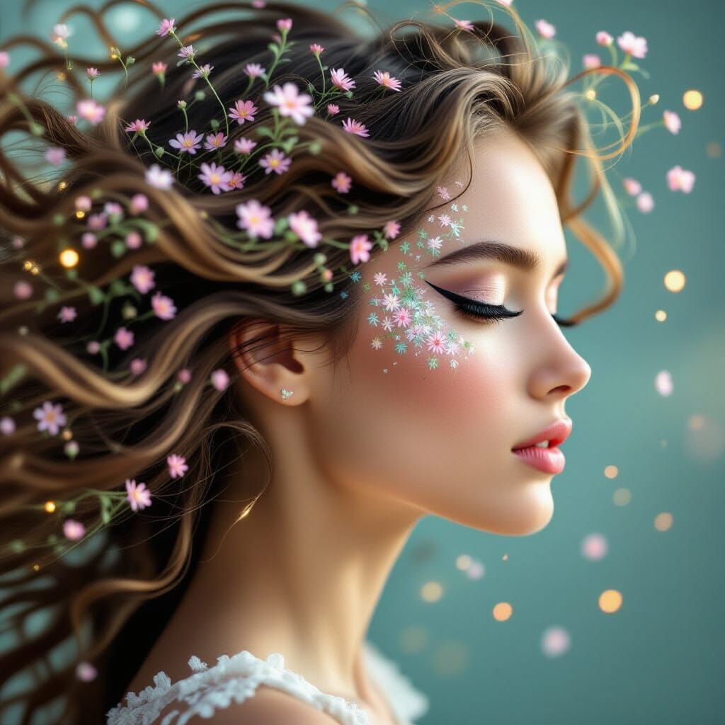 This image shows a side view of a young woman with winged eyeliner. Her hair is depicted as a turbulent sea, interwoven with tiny floral buds and strands of light.