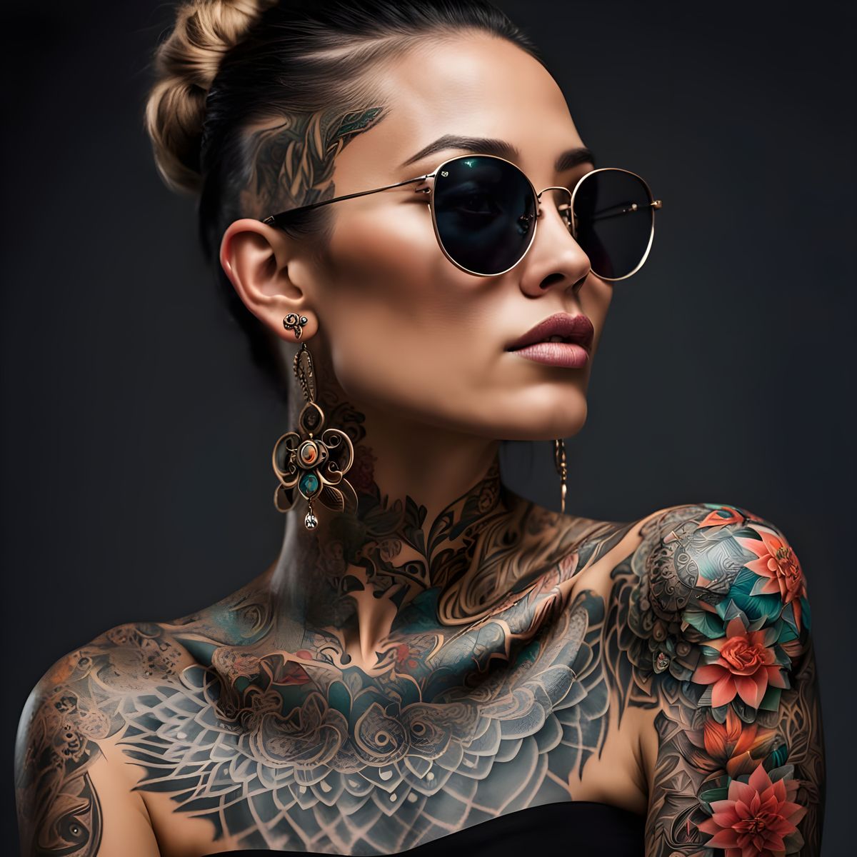 This image showcases a girl with a stunning, intricately designed neon tattoo on her back, blending vibrant colors and meticulous detail in a captivating scene of confidence and artistry.