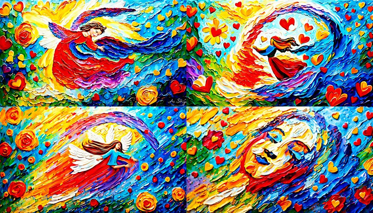 A beautiful painting of an angel in flight, radiating light and grace. This impasto artwork captures a celestial being with vibrant colors and textured brushstrokes.