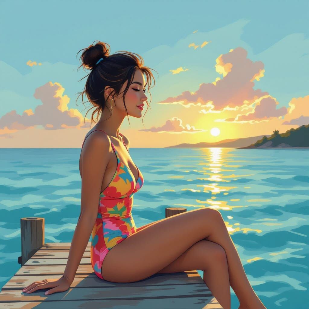 A vibrant image of a woman in a swimsuit sitting on a pier at sunrise. The serene scene features a deep blue ocean, distant islands, and a warm-toned sky, rendered with soft brushstrokes and warm colors.