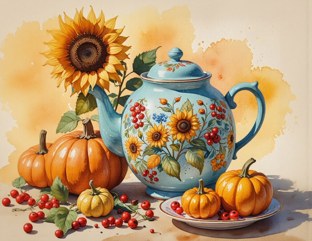 This image is a stylized watercolor sketch depicting autumn elements like a teapot, sunflower, pumpkin, and rowan berries, suitable for a logo or sticker.