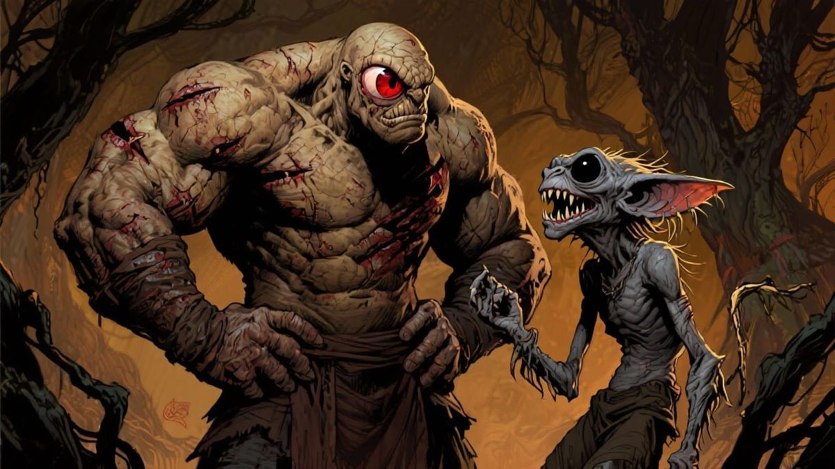 This image shows a powerfully built cyclops and a skinny goblin in a dynamic fantasy art style. The scene features bold linework, earthy tones, and dramatic lighting, evoking raw energy.