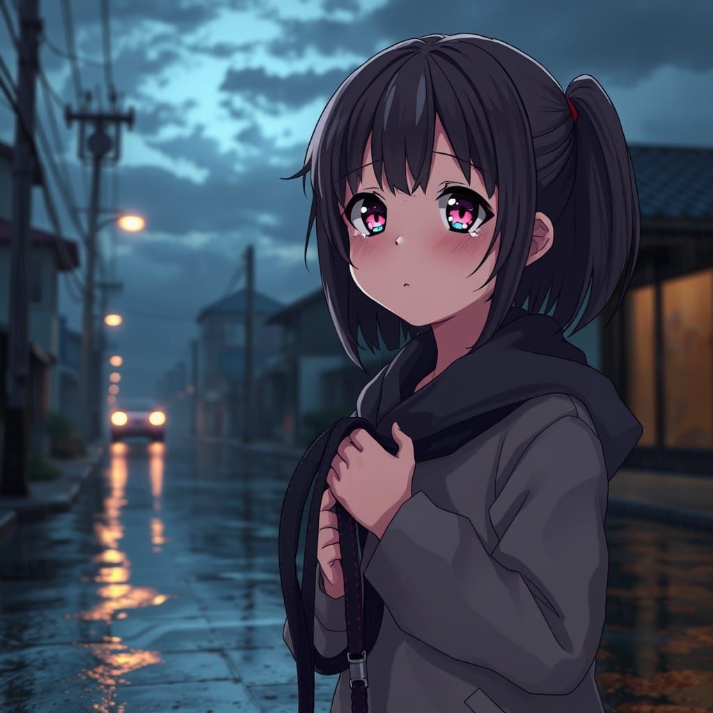 This 3D anime art depicts a sad young girl holding an empty dog leash on a wet street at twilight. Features dramatic lighting and detailed textures.