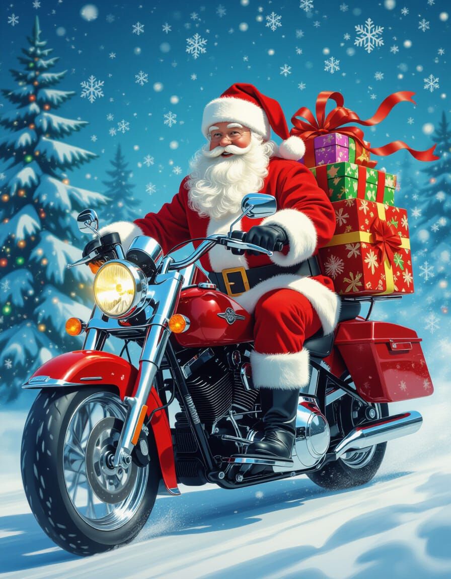 A realistic image of Santa Claus on a motorcycle, delivering gifts against a festive Christmas backdrop. The scene is rendered with vibrant colors and dynamic composition, in a photorealistic style.