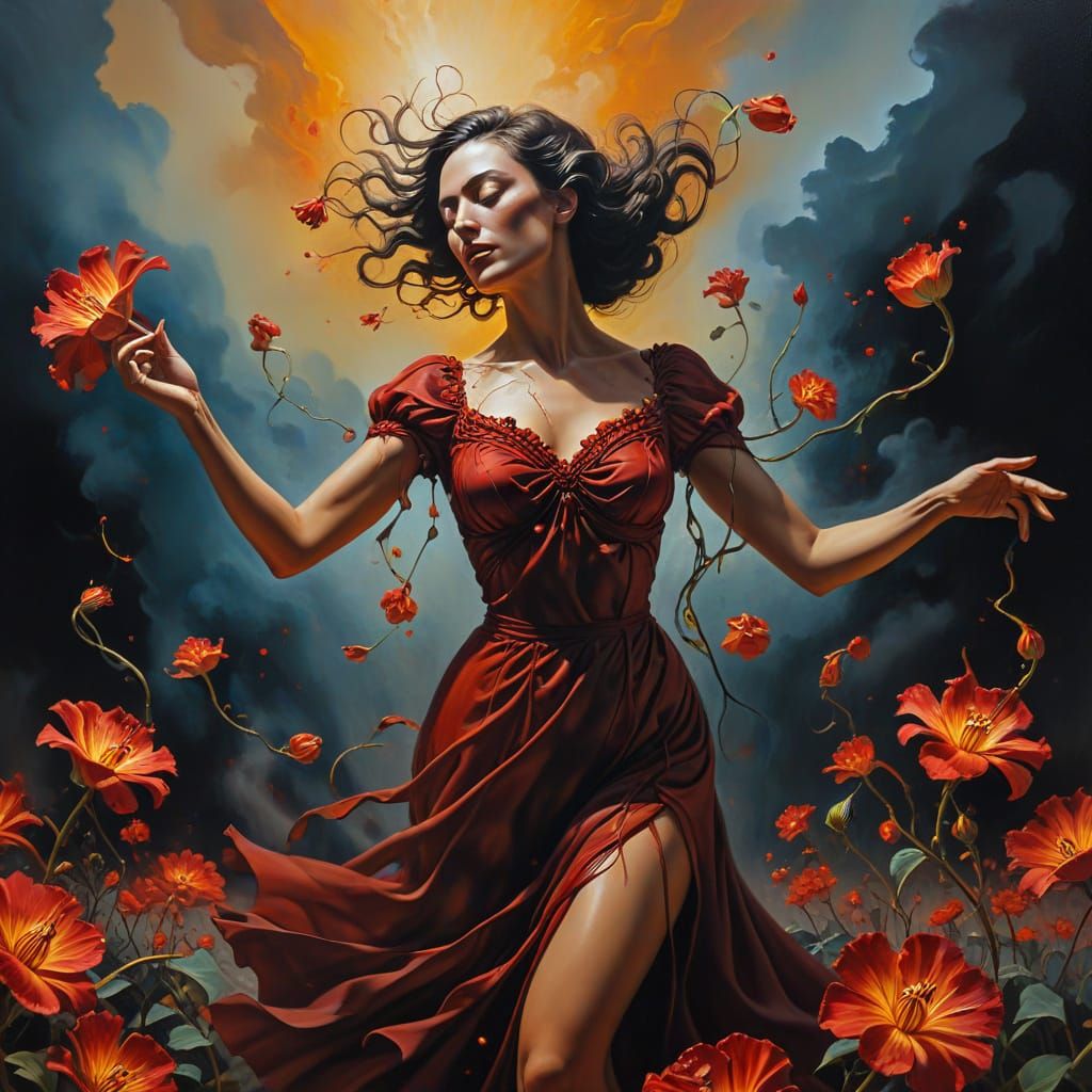A surreal oil painting of a woman dancing with flowers in a dreamlike setting. The artwork features twisted stems and vibrant petals, with a melting background and eerie fog, rendered in a surreal style.