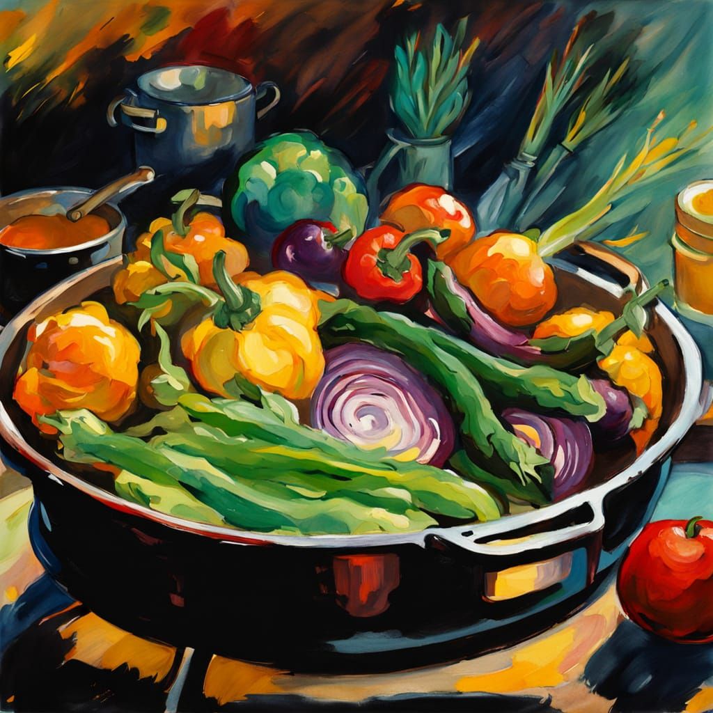 This image captures a joyful scene of small vegetables gathered in a pan, bathed in warm golden light and soft pastel hues, evoking a playful and whimsical atmosphere reminiscent of a watercolor painting in the style of Vincent van Gogh.