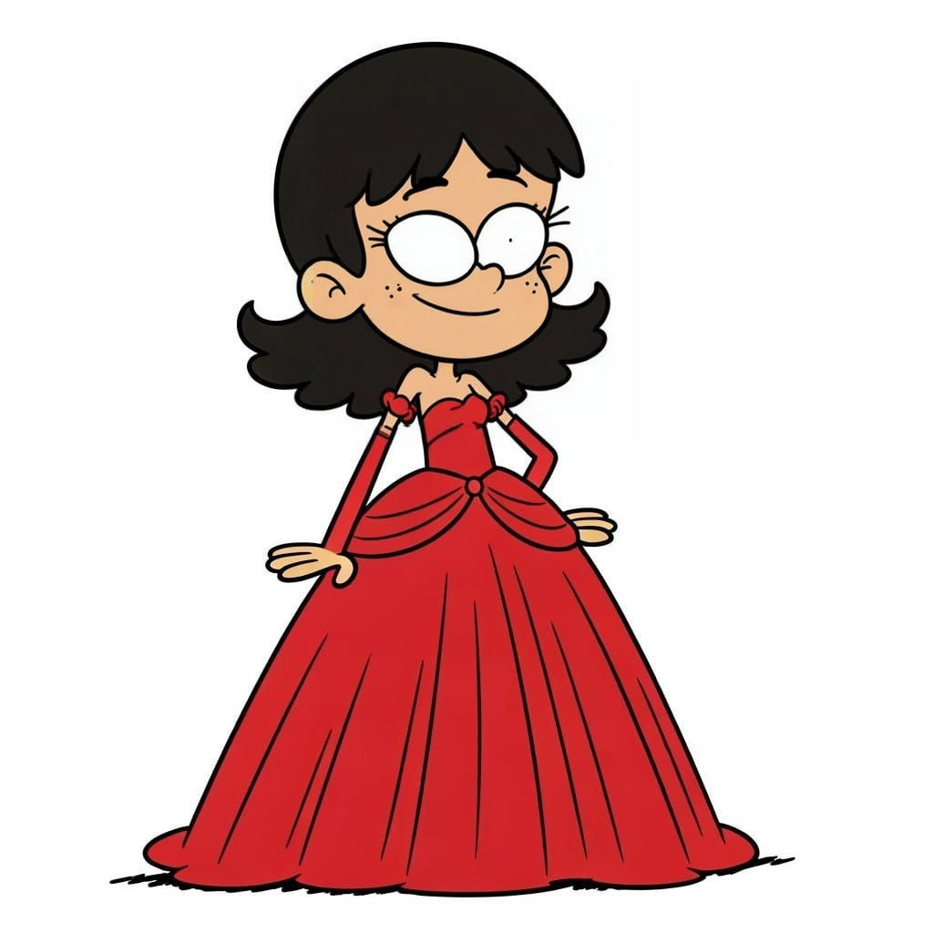 "The Loud House cartoon style: Stella Zhau wearing a long red tulle ball gown."