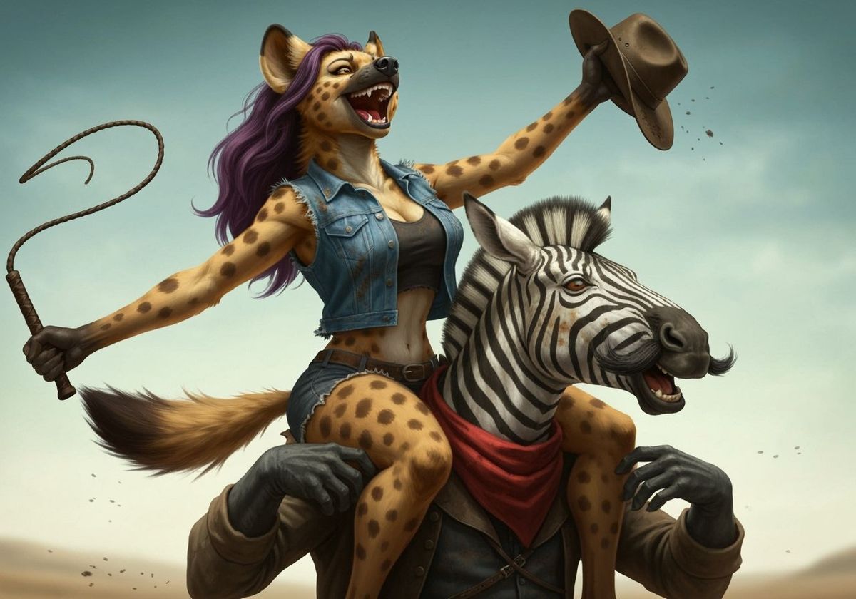 A gritty, photorealistic Western scene featuring an anthropomorphic hyena riding a zebra. Inspired by Spaghetti Westerns, with a shadowy, ethereal atmosphere and film grain.