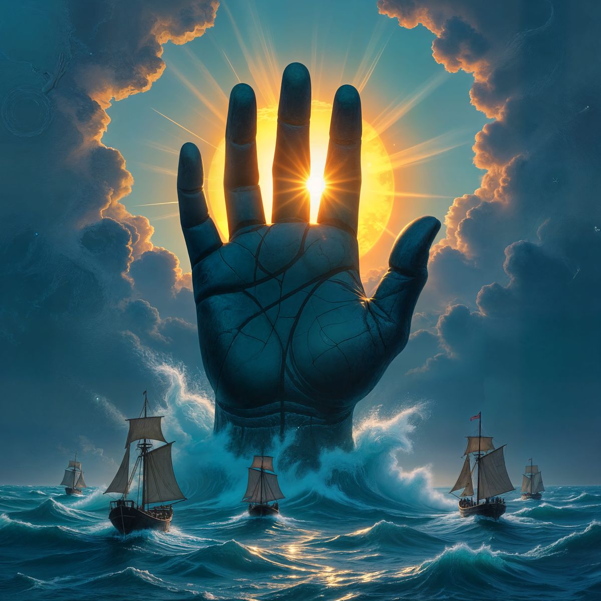 This image depicts a colossal stone hand emerging from a turbulent ocean, holding the sun. Tiny ships sail below the dramatic, epic fantasy scene rendered with intense light and shadow.