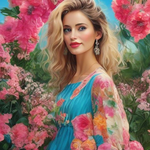 A vibrant close-up oil painting of a woman in a pink dress. The macro photograph features soft brushstrokes, delicate fabric, warm lighting, and soft focus to create delicate textures.
