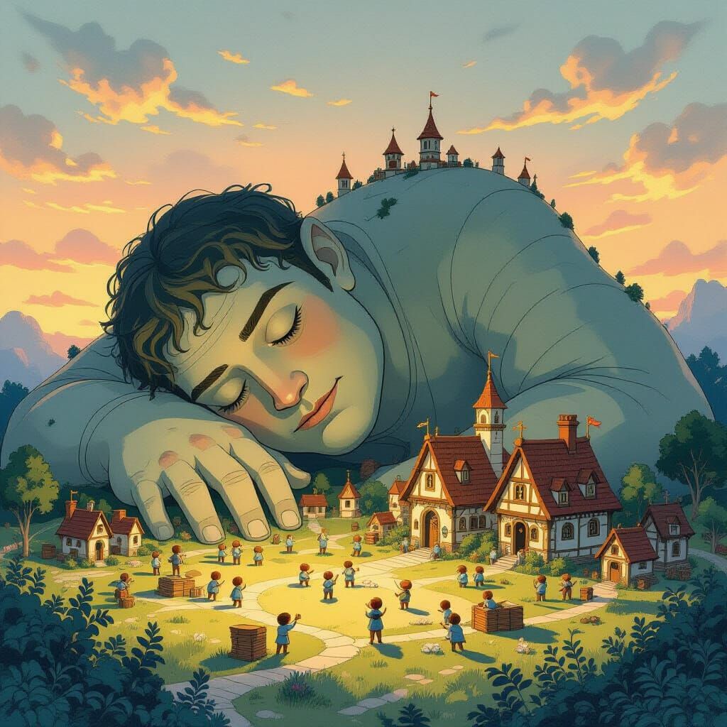 This image shows tiny lilliputians building around a colossal sleeping giant in a twilight landscape. Rendered in a vibrant, storybook illustration style with fine linework, evoking classic fairytale art.