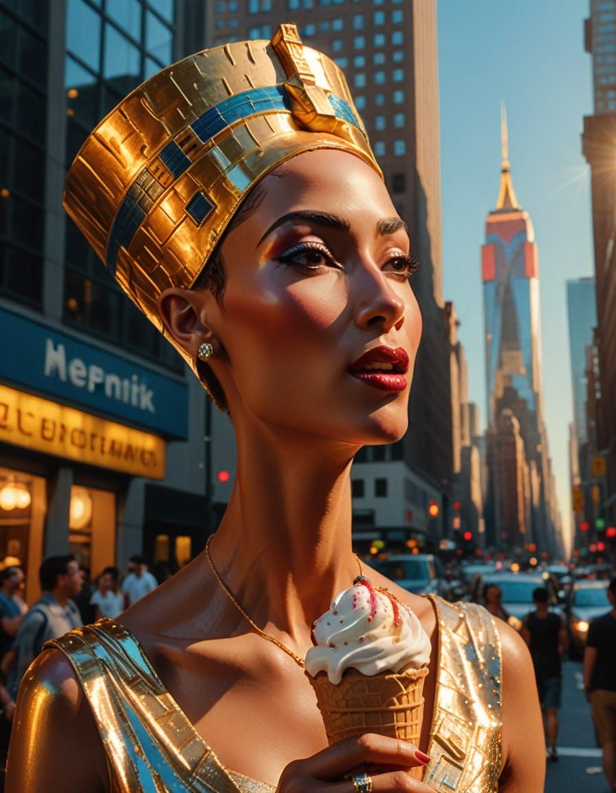 This hyper-realistic image shows Nefertiti enjoying an ice cream cone with vibrant NYC skyscrapers in the background. Features warm golden lighting and stunning detail.
