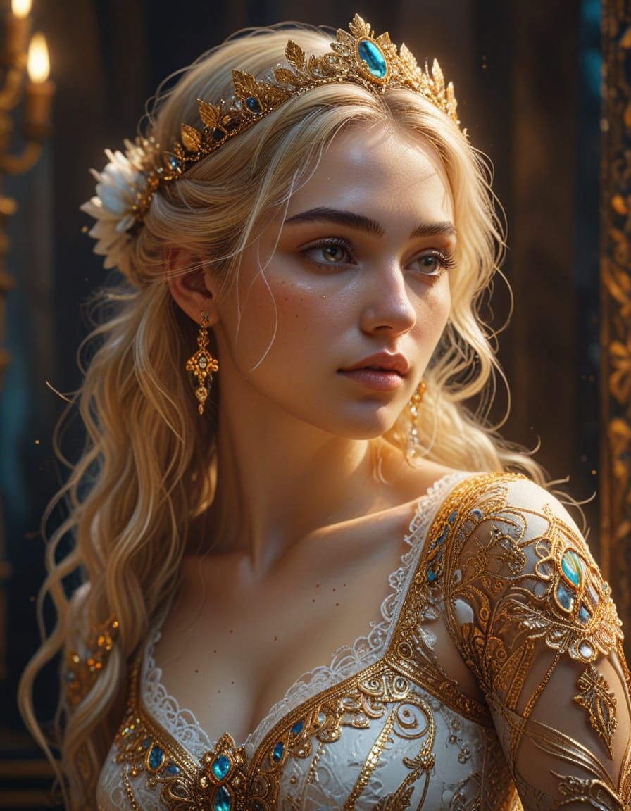 This hyperrealistic digital painting features a young woman as the Goddess of Purity, Beauty, and Souls, kneeling gracefully. Detailed lace and gold accents adorn her clothing under ethereal lighting.