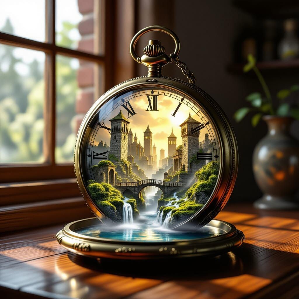 This image shows a hyper-realistic 3D render of an antique pocket watch. Inside its face, a detailed miniature lost city with ruins and waterfalls is visible, blending fantasy and reality with cinematic lighting.