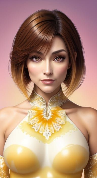 This image depicts a beautifully rendered watercolor portrait of a figure with symmetrical facial features, set against a warm honey-toned warehouse background. The artwork showcases intricate details and a striking fractal gradient effect.