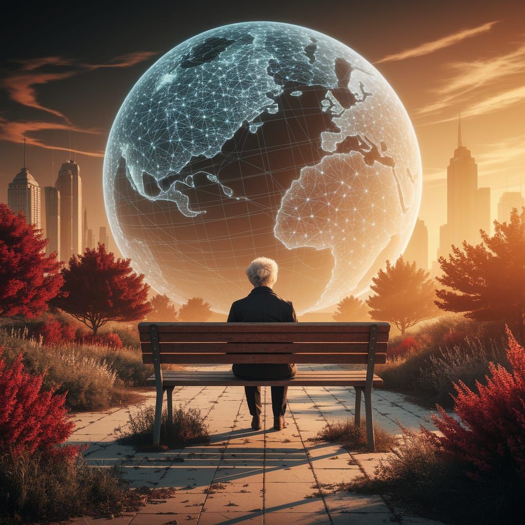 This image shows an elderly woman on a park bench looking at neural networks enveloping Earth. The photograph is reminiscent of Gregory Crewdson's style, with overgrown gardens, fog, and a melancholic atmosphere in 4K.