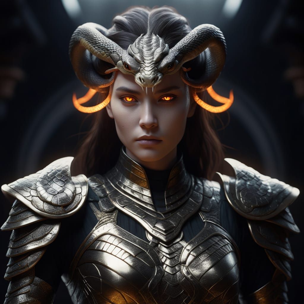 This image shows a pale demonic woman with snake hair, wearing dark metallic armor. A glowing orange-gold ring forms a halo behind her head in a dark, dramatic setting.
