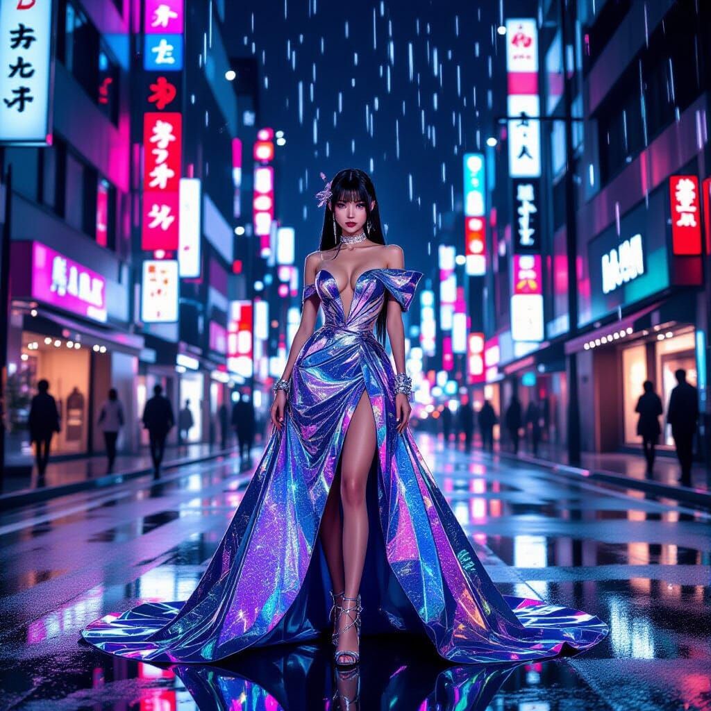 This image features a striking anime fashion model with long, bejeweled nails in a shimmering futuristic gown on a neon-lit Tokyo street. It blends high-fashion photography with a cyberpunk anime style, featuring sharp lines and dramatic lighting.