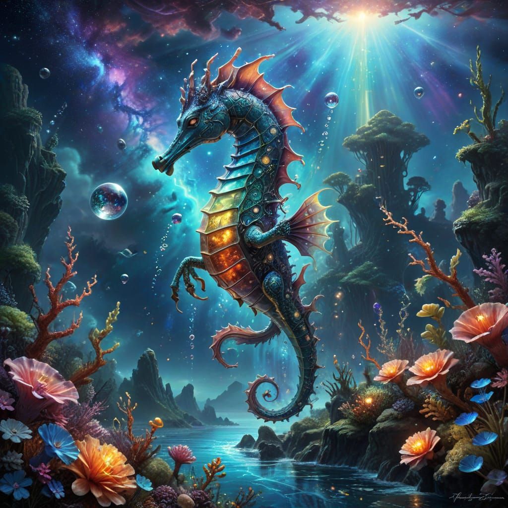 This image shows a seahorse-shaped rocket launching from a coral reef on an alien planet. The rocket features bioluminescent algae and leaves a trail of bubbles, rendered as detailed fantasy art.