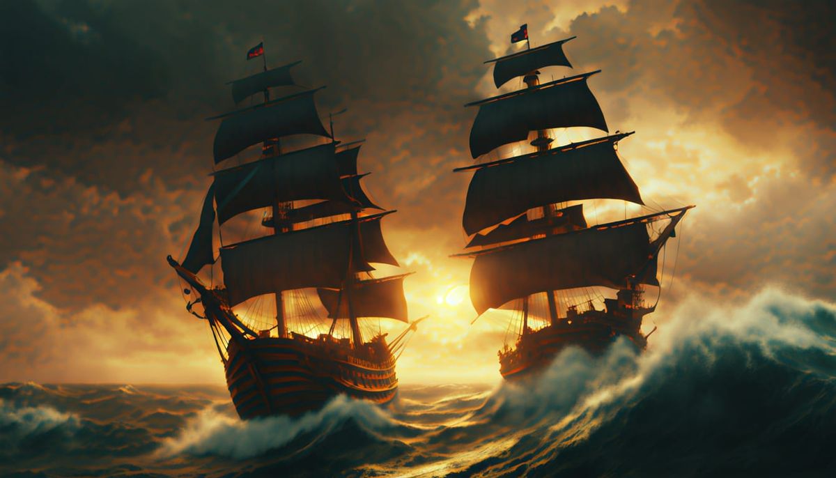 A dramatic image showcasing a pirate ship navigating a tempestuous sea. The scene is bathed in the warm glow of a sunset, with intense waves and atmospheric mist creating a cinematic feel.