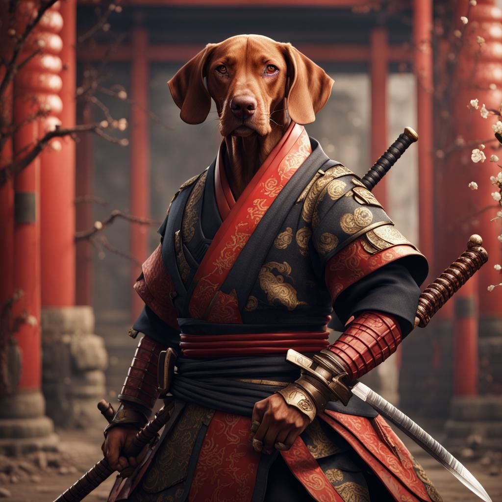This image shows a Vizsla dog in samurai attire, wielding a katana. The artwork features a detailed matte painting style with deep colors and intricate details, reminiscent of fantasy concept art.