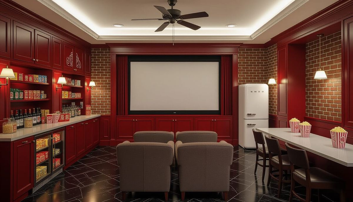 This image depicts a meticulously clean Victorian theater room featuring a wide movie screen, dark red cabinets stocked with snacks, and plush seating. The cinematic wide-angle view highlights brick wallpaper and black marble flooring with dramatic lighting.