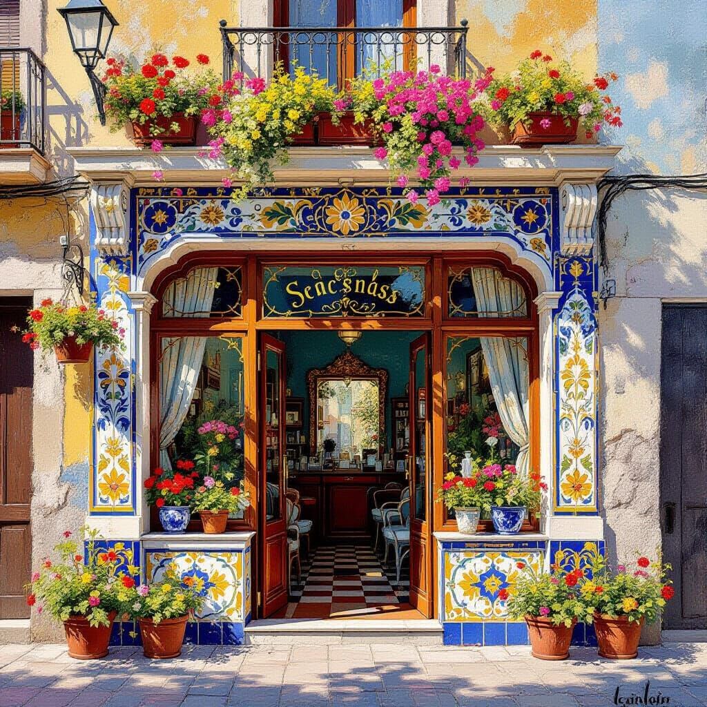 A serene vintage Spanish hair salon facade with ornate details and colorful tiles. The scene is surrounded by vibrant flowers, captured in an impressionistic style.