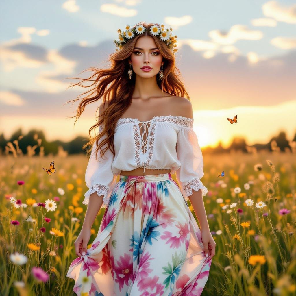 A whimsical watercolor painting shows a woman with auburn hair adorned with a daisy crown. She walks through a wildflower meadow under a sunrise sky in an art nouveau style.