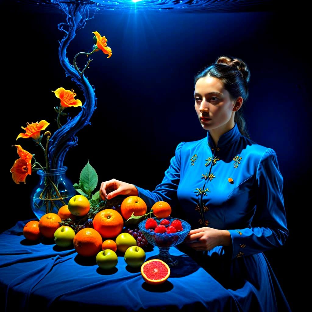 beautiful fantastic surrealistic composition featuring hyperrealistically depicted colorful fantastic transparent plants glowing from the inside and colorful fantastic transparent fruit glowing from the inside in rich saturated colors in dark twilight under dark sky in deep intense blue; fluorescence, ...