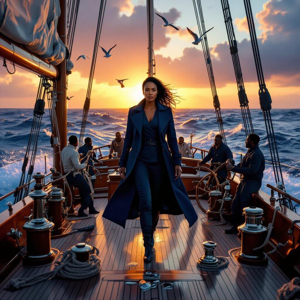 A determined Black female captain stands on a luxury yacht during a turbulent sunset. Diverse crew members work urgently amidst cinematic lighting and dynamic ocean waves.