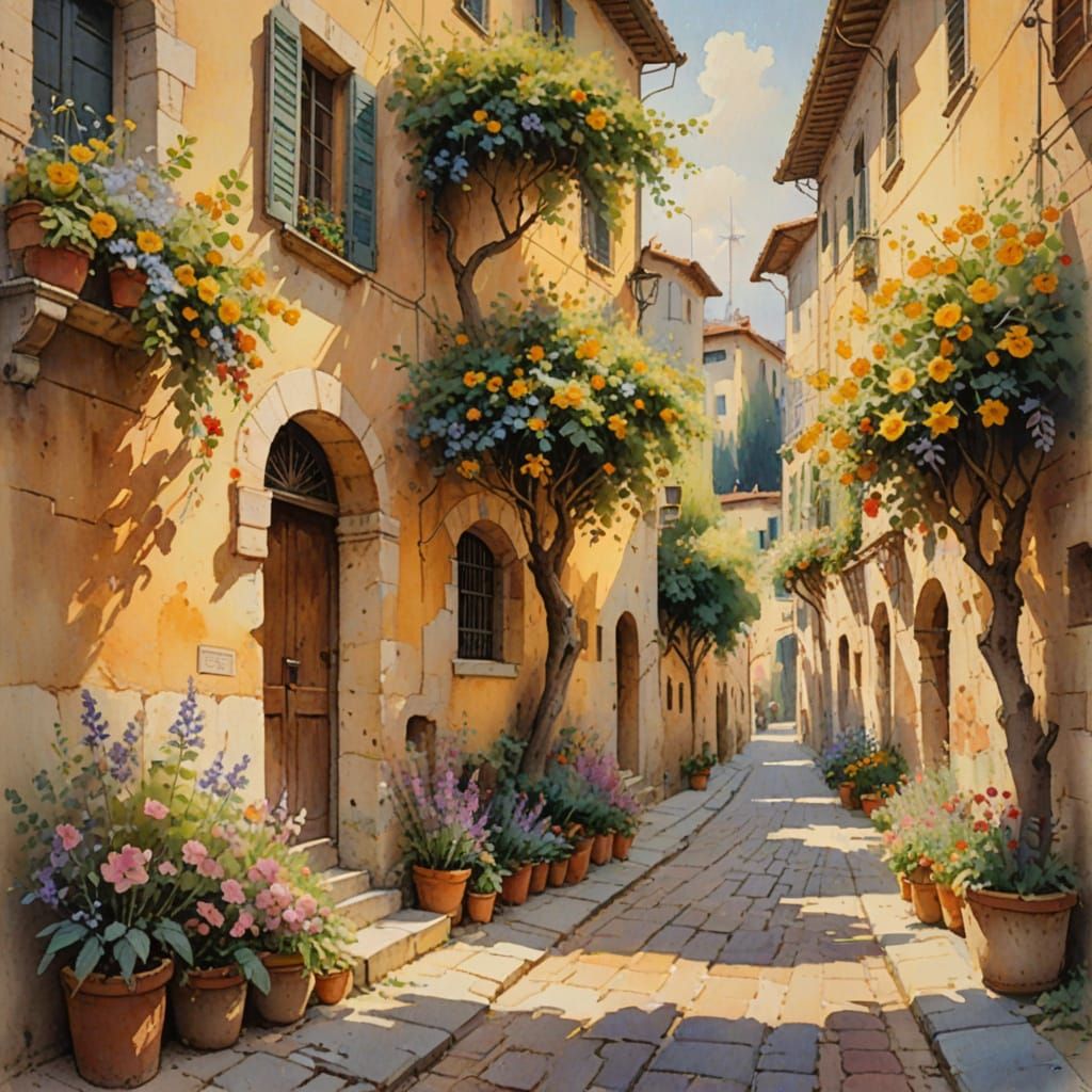 A vibrant watercolor painting of an old Italian street filled with flowers and a tree. Soft focus and heavenly golden light create a serene atmosphere with soft pastel colors in an impressionist style.