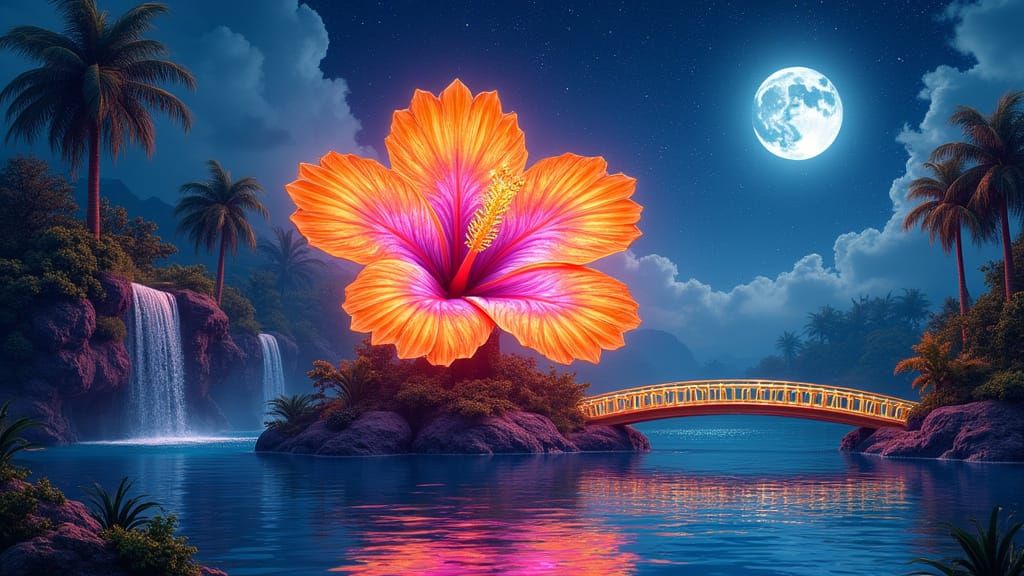 This image shows a massive, glowing hibiscus sculpture in vibrant neon colors, crafted from detailed metal and set in a tranquil pond. It features a waterfall and starry sky, rendered in a watercolor style.