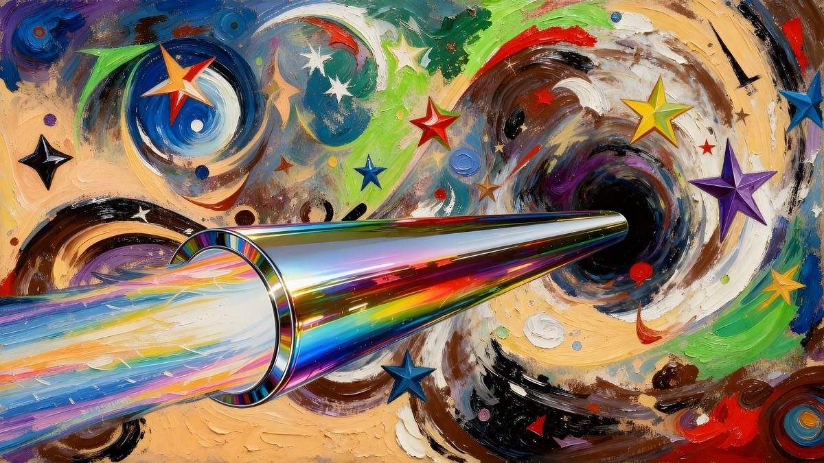 This image showcases a sleek, seamless rainbow-enamel cylinder with a vibrant, flowing exhaust. It mirrors a deep, diverse vortex of impasto oil paint and swirling, multi-pointed stars in bold, clashing colors.