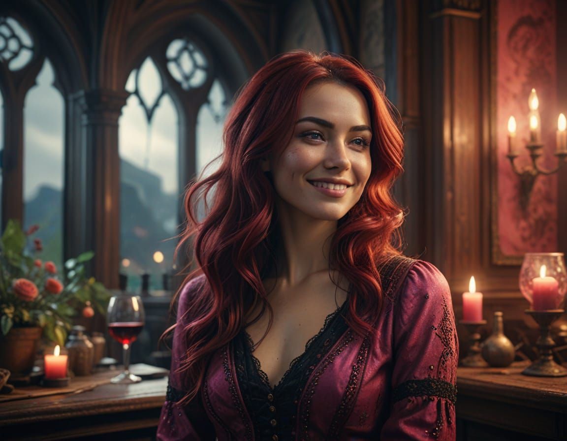 This image showcases a beautiful woman in a lavish, antique-style house room, surrounded by deep, rich colors and intricate details, evoking a sense of fantasy and wonder.