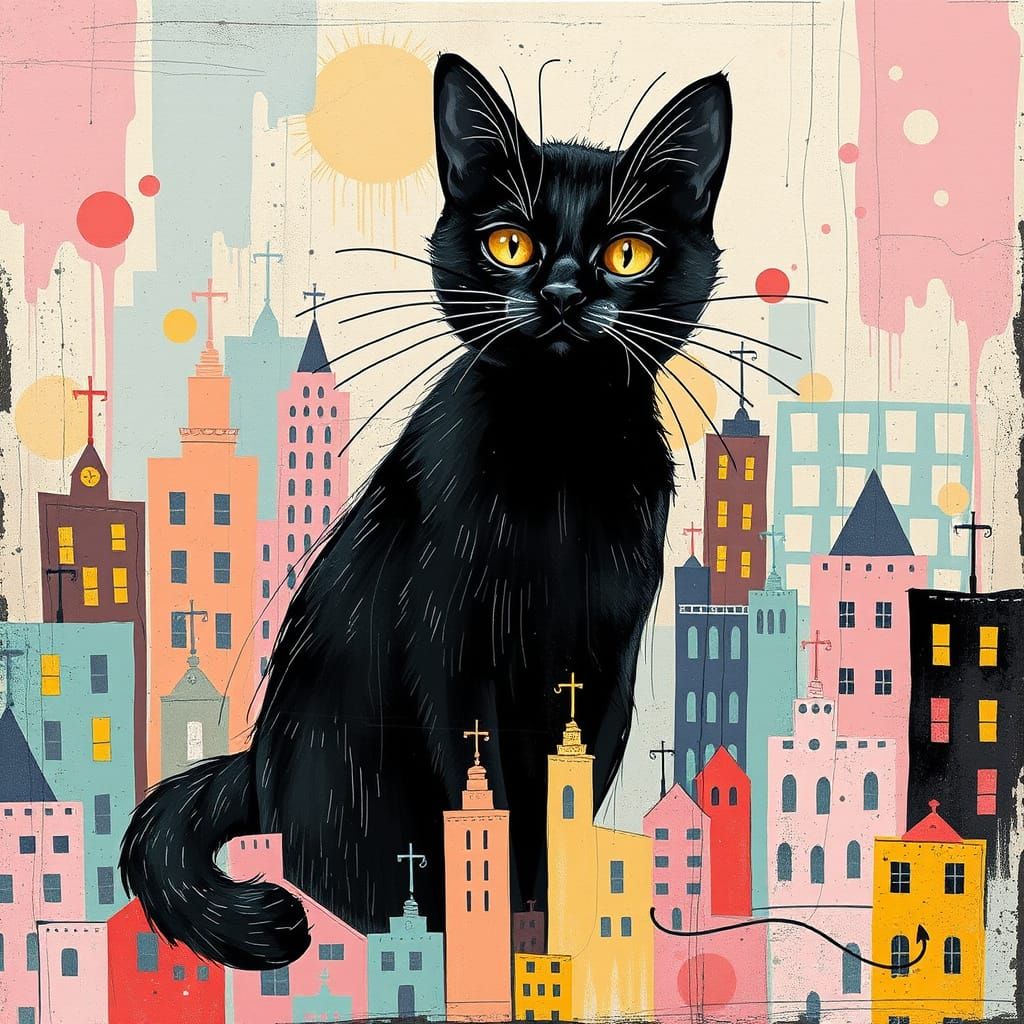 This image shows a surreal, whimsical city scene featuring a black cat. The artwork employs a distressed, tactile abstraction technique and a soft pastel color palette.