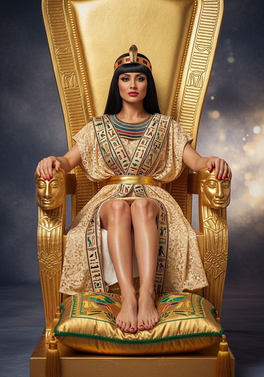 This image shows an Egyptian queen regally posed on a golden throne. Her red toenails accent the luxurious scene, professionally photographed with a soft bokeh and natural light, in a style evocative of high-fashion portraiture.