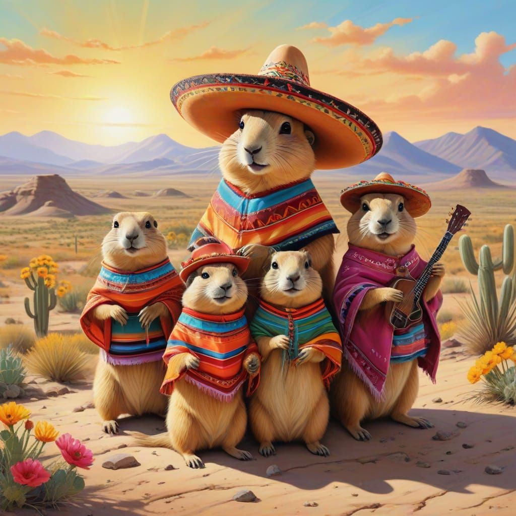 "Six prairie dogs wearing colorful sombreros and traditional Mexican ponchos, all standing away from each other on separate dirt mounds. Standing proudly on top of their own separate dirt mound above holes they’ve dug in a dry desert landscape. :Two of the Prairie Dogs are playing a guitar: The desert ...