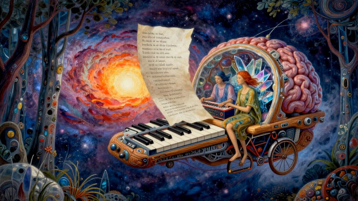 This image shows ethereal figures creating surreal poems on a futuristic keyboard within a glass forest during a sunset galaxy voyage. Features dynamic particulates and rich colors in an oil on ceramic texture.