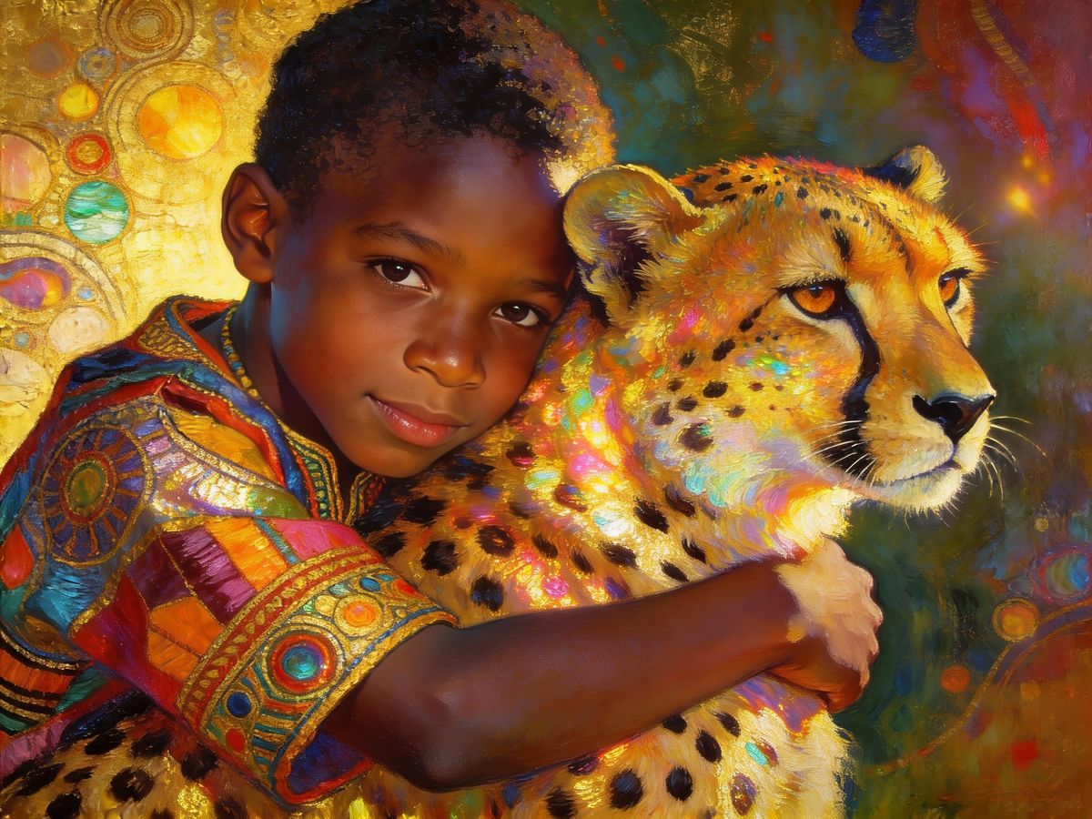 A hyperrealistic portrait of an African boy in traditional attire embracing a cheetah, featuring shimmering colors and thick impasto textures reminiscent of Klimt and Matisse.