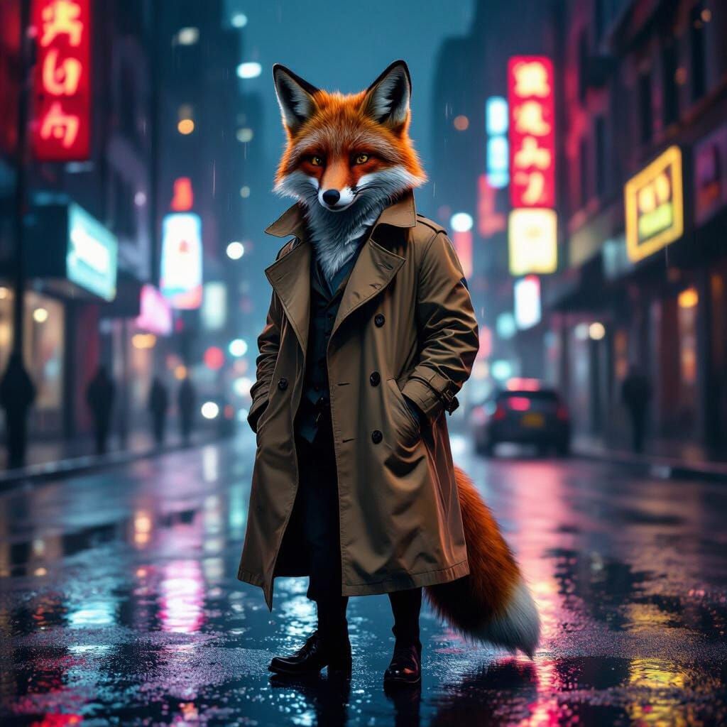 This image shows an anthropomorphic fox in a trench coat standing on a rain-slicked street at night. Neon signs reflect off the pavement in an atmospheric, film noir scene with soft, airbrushed shading.