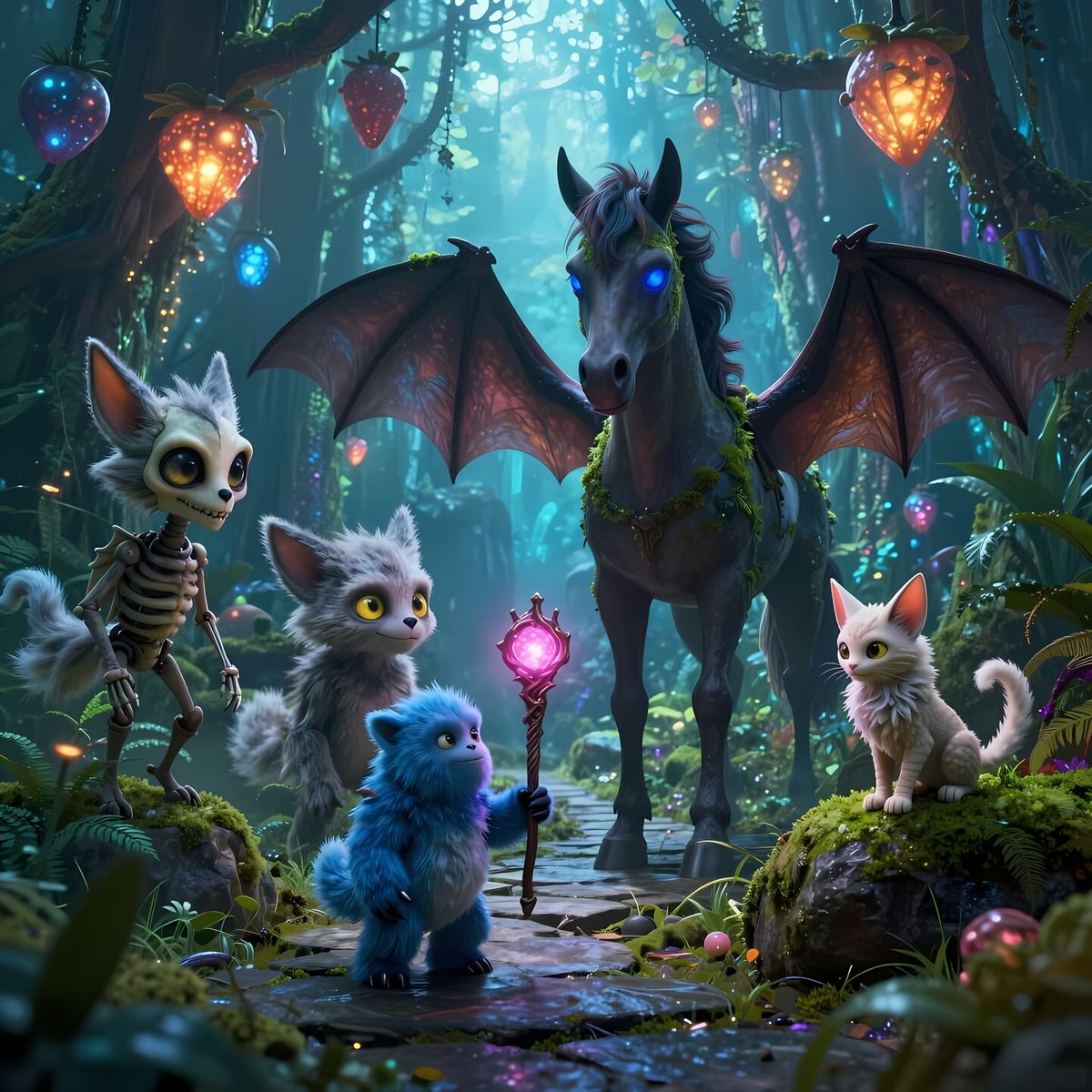 This image shows a mysterious, bioluminescent alien rainforest with glowing fruits and mythical creatures. Cinematic lighting and volumetric fog create a deep jungle atmosphere.