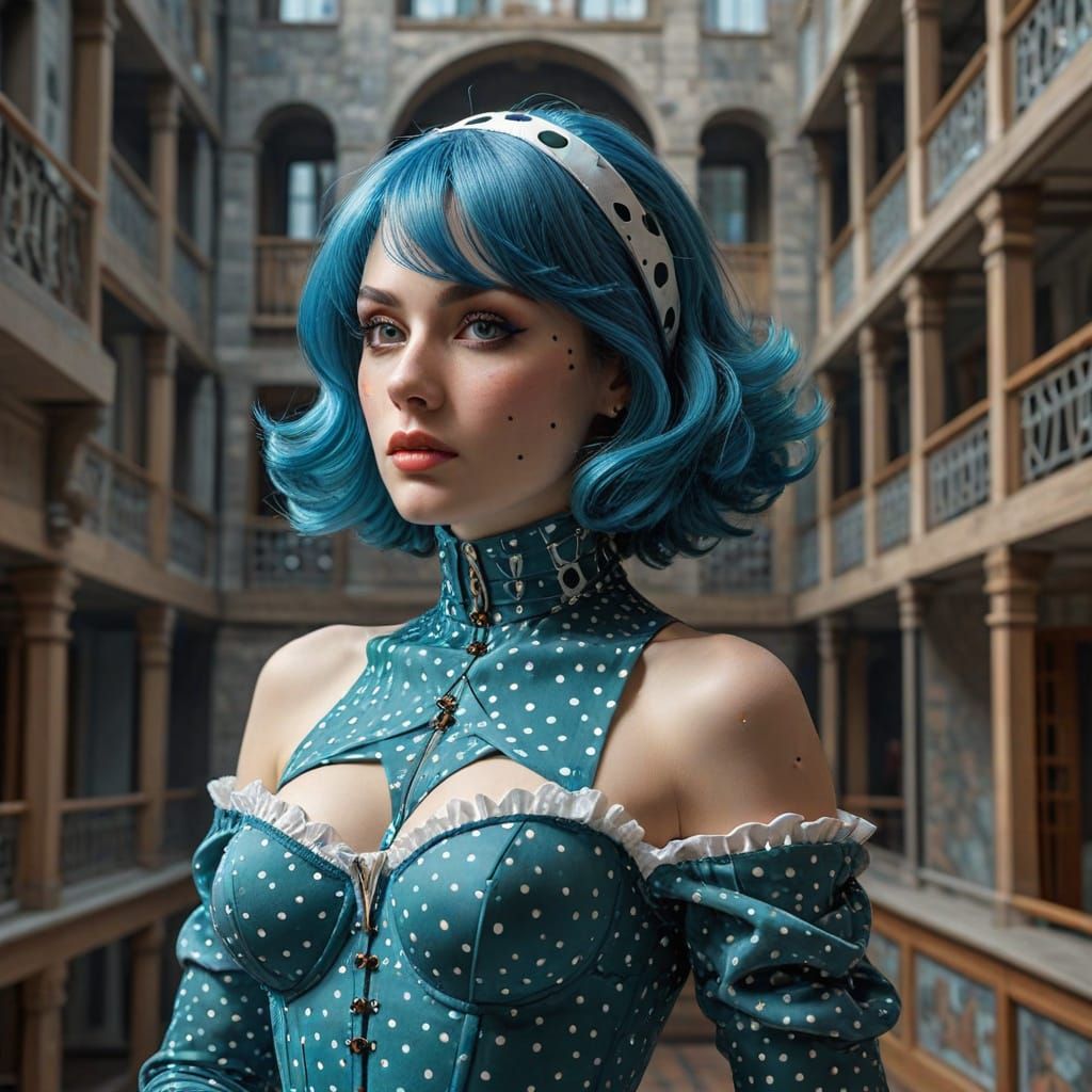 This image shows a crossdresser in fancy dress with polka dots. The androgynous figure has masculine features and is rendered in hyperdetailed 8K resolution with optical illusion effects.