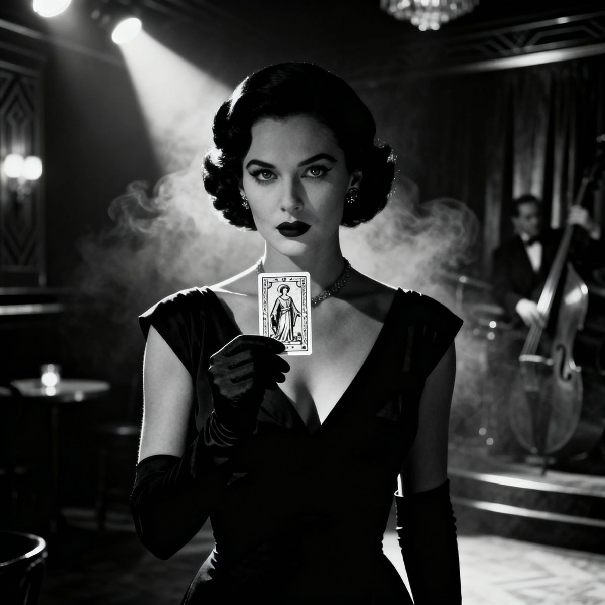 This image depicts a sophisticated femme fatale in a dimly lit jazz club, holding a tarot card. The scene features dramatic lighting and a mysterious, elegant art deco atmosphere, rendered with hyperrealistic detail in a film noir aesthetic.