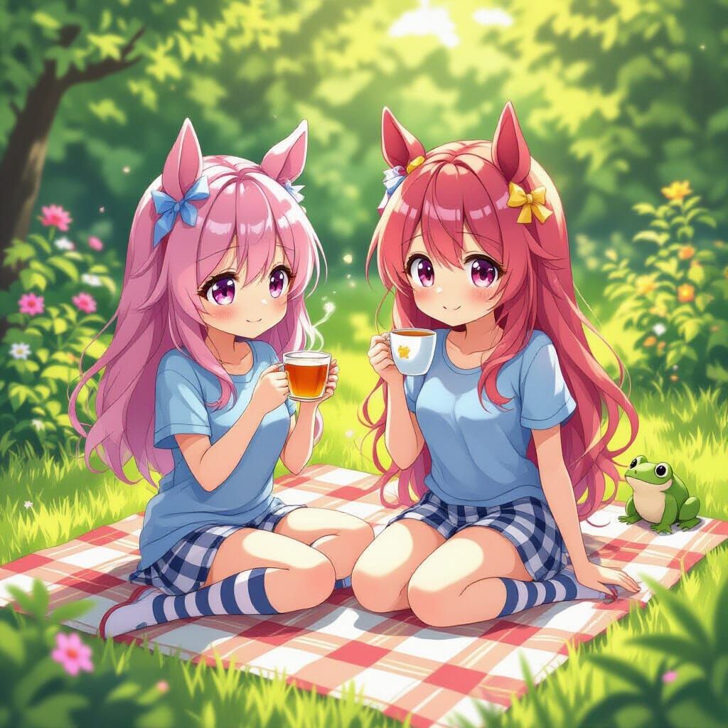 A cel-shaded anime girl with horse ears drinks tea with a frog on a blanket. The image features vibrant colors and intricate details in a manga style.